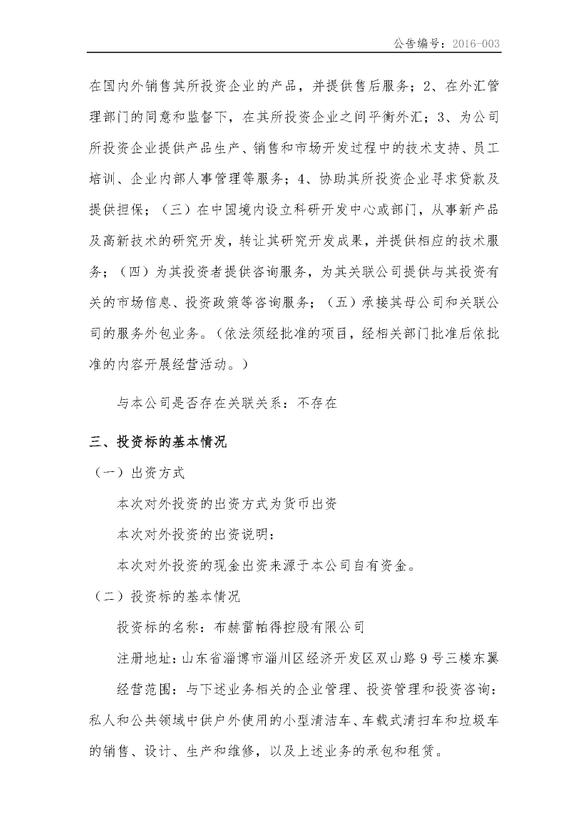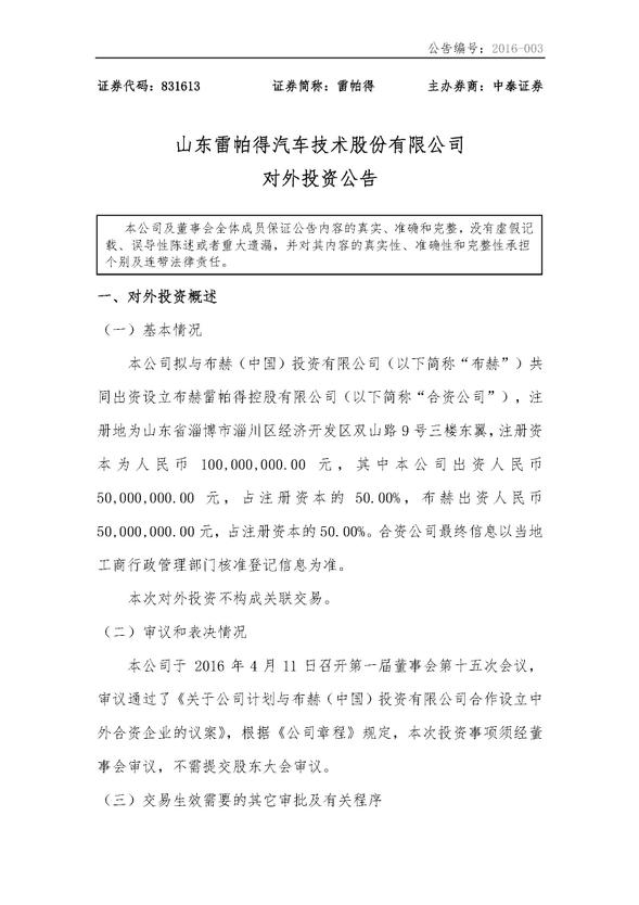 山東雷帕得汽車技術(shù)股份有限公司對(duì)外投資公告