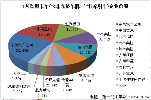 行業(yè)資訊2015年1月份,重型卡車(含非完整車輛、半掛牽引車)銷售39990輛,銷量排名前十的企業(yè)共計(jì)銷售39070輛,占據(jù)整個(gè)重型卡車市場(chǎng)總銷量97.70%的份額。排名如下: