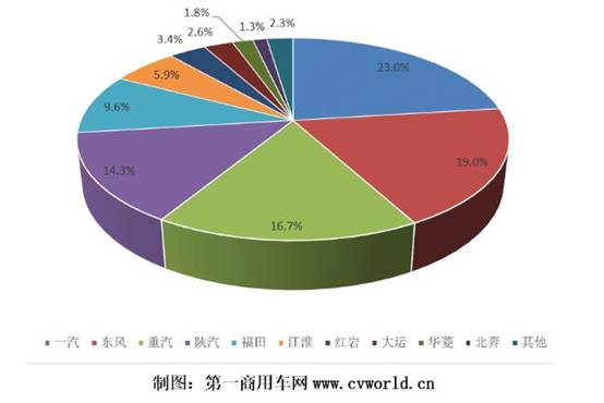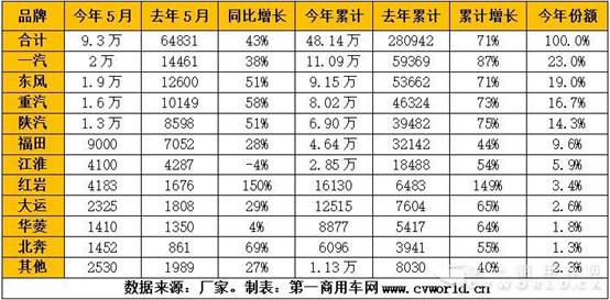 從各家企業(yè)的表現(xiàn)來看,1-5月,一汽解放累計(jì)銷量達(dá)到11.09萬輛,同比增長(zhǎng)87%,市場(chǎng)占有率為23%,繼續(xù)保持行業(yè)第一的位置;東風(fēng)重卡累計(jì)銷售9.15萬輛,同比上漲71%,市場(chǎng)份額19%,穩(wěn)居行業(yè)前二;中國(guó)重汽銷售各類重卡8.02萬輛,同比增長(zhǎng)73%,市場(chǎng)占有率為16.7%;陜汽保持行業(yè)第四,今年前五月累計(jì)銷售重卡6.90萬輛,同比增長(zhǎng)75%,份額為14.3%;福田汽車?yán)塾?jì)銷售重卡4.64萬輛,同比增長(zhǎng)44%,份額9.6%。