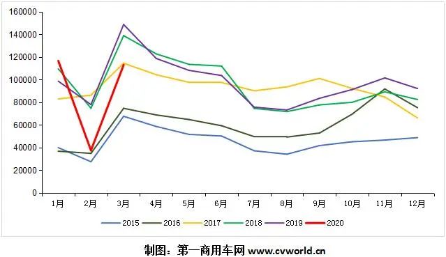2020年一季度的重卡市場(chǎng),受新冠肺炎疫情影響,累計(jì)銷量(26.72萬(wàn)輛)同比下降18%,比上年同期減少了近6萬(wàn)輛的銷售。雖然1月份創(chuàng)下歷史新高,取得了開門紅,但2、3月份市場(chǎng)連續(xù)出現(xiàn)大跌。具體來看,2020年3月,我國(guó)重卡市場(chǎng)共約銷售各類車輛11.3萬(wàn)輛,同比下滑24%,環(huán)比增長(zhǎng)2倍。總體來看,重卡市場(chǎng)從2019年下半年直至今年3月份的發(fā)展態(tài)勢(shì),基本可以形容為“七連漲”被和“兩連降”:2019年7月(1.5%)、8月(2%)、9月(7.5%)、10月(14.1%)、11月(13.8%)、12月(11.7%),2020年1月(18.2%)這七個(gè)月連續(xù)上漲,2020年2月和3月則連續(xù)兩個(gè)月下滑,同比分別下降52%和24%。