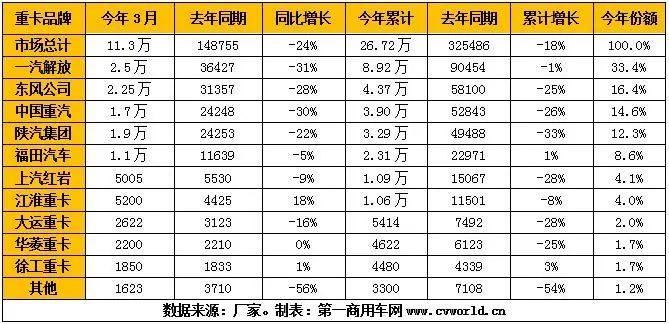中國(guó)重汽3月份銷售重卡1.7萬(wàn)輛,排名行業(yè)第四;1-3月,中國(guó)重汽累計(jì)銷售重卡3.9萬(wàn)輛,市場(chǎng)份額為14.6%,累計(jì)銷量排名行業(yè)第三,僅次于解放和東風(fēng)。陜汽集團(tuán)3月份銷售重卡約1.9萬(wàn)輛,躍升行業(yè)第三;1-3月累計(jì)銷售重卡3.29萬(wàn)輛,市場(chǎng)占有率為12.3%。福田汽車3月份銷售歐曼重卡約1.1萬(wàn)輛,今年1-3月累計(jì)銷售重卡2.31萬(wàn)輛,同比增長(zhǎng)1%,市場(chǎng)份額上升至8.6%。福田汽車也是今年一季度重卡行業(yè)僅有的兩家同比增長(zhǎng)的企業(yè)之一。