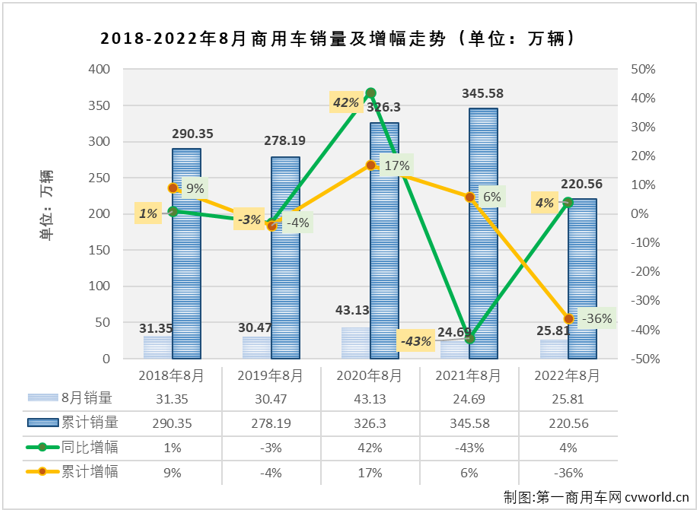 25.81萬輛在商用車市場里算什么水平的表現(xiàn)?翻看歷史數(shù)據(jù)我們不難發(fā)現(xiàn),2月份、7月份和8月份正是商用車市場較“低產(chǎn)”的月份,最近8年,商用車市場銷量在2月份有7次不足30萬輛,7月份有6次,8月份則有4次。縱觀近五年8月份商用車銷量及增幅走勢圖可見,近五年8月份的商用車市場走出一個增-降-增-降-增的趨勢。從數(shù)字上看,今年8月份商用車市場僅銷售25.81萬輛,顯然處于低位,但卻并不是最低,5年最低位是2021年8月份的24.69萬輛。今年8月份25.81萬輛的表現(xiàn)與5年最高位的2020年8月份相比,有超17萬輛的差距,還不足當月銷量的60%,與2018年及2019年8月份相比也至少有5萬輛左右的差距。因此,8月份商用車市場雖收獲了2022年的首次增長,但距前幾年的“正常水準”仍有較大差距,可以說,8月份的增長帶給市場的信心相當有限。