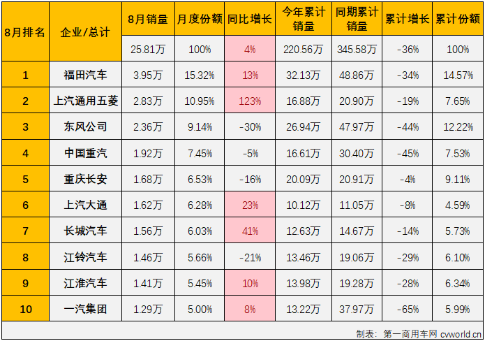 上表可見,2022年8月份,商用車市場同比增長4%,銷量增幅從上月(-21%)實現(xiàn)轉(zhuǎn)正。與前兩個月一樣,下滑并不是8月份商用車市場的唯一旋律,且8月份商用車市場實現(xiàn)增長的企業(yè)數(shù)首次超過了下滑的企業(yè)數(shù)。8月份商用車銷量排行前十企業(yè)6增4降:福田、五菱、大通、長城、江淮和一汽6家企業(yè)實現(xiàn)增長,8月份銷量同比分別增長了13%、123%、23%、41%、10%和8%;下滑的企業(yè)中有3家降幅仍達到兩位數(shù),下滑最嚴重的企業(yè)8月份銷量同比下降了30%。