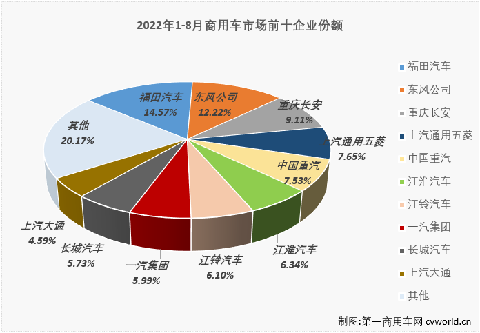 從市場份額來看,8月份銷量前十企業(yè)合計份額達到77.8%,排名前五的企業(yè)合計份額達到49.39%。8月份,商用車市場繼續(xù)僅有2家企業(yè)份額超過10%,福田和五菱分別分食了8月份商用車市場15.32%和10.95%的份額。